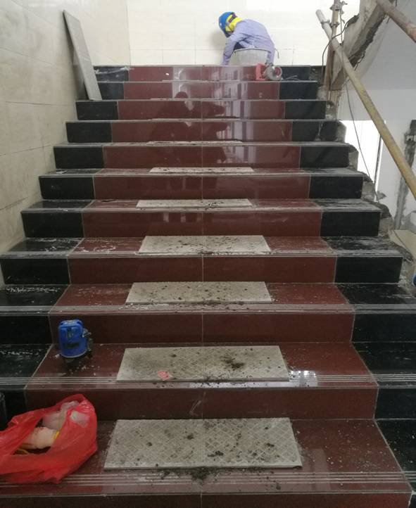 图一 工人正在进行6#楼楼梯间地砖的铺设