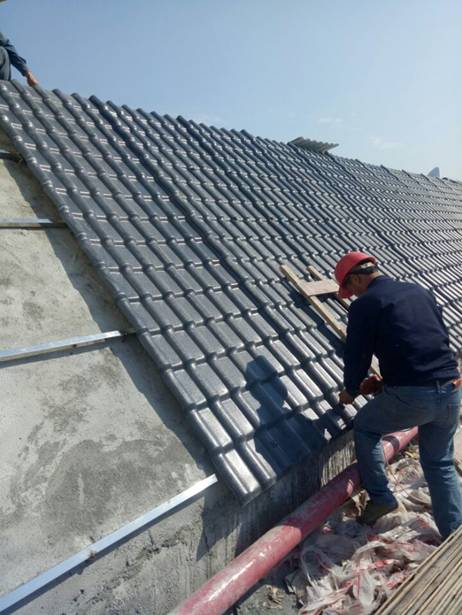 图一 工人正在进行6#楼屋面瓦的铺设