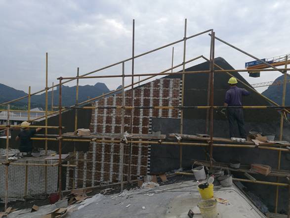 图一 工人正在进行6#楼出屋面楼梯的外墙贴砖
