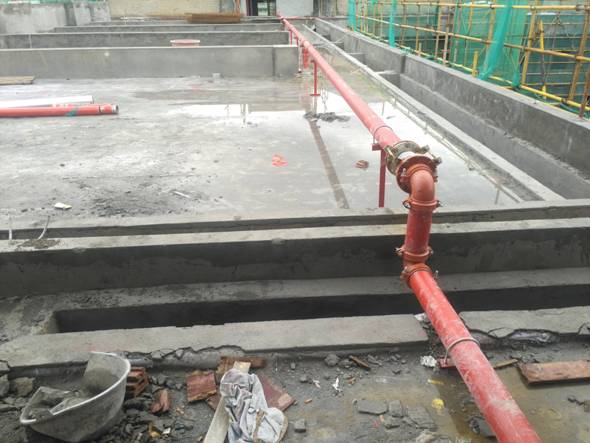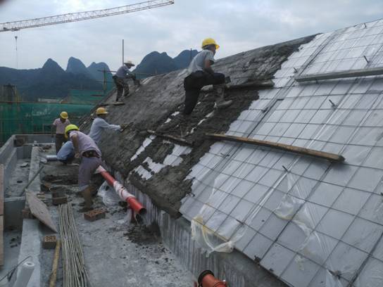 图二 6#楼斜屋面正在进行细石混凝土防水层的施工