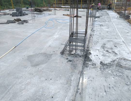 图二: 6#楼东南区域二层楼板浇筑完毕,工人正在进行混凝土楼板的养护
