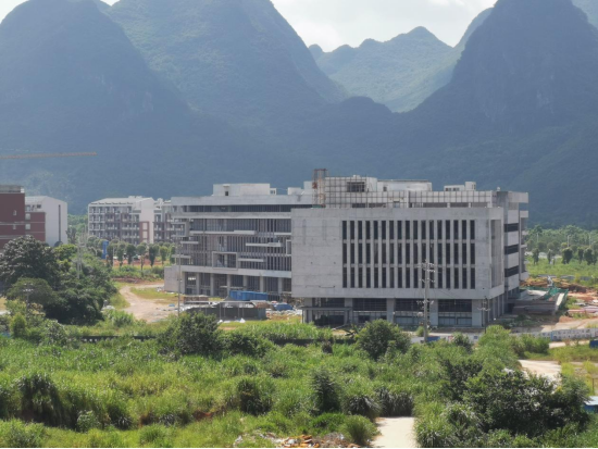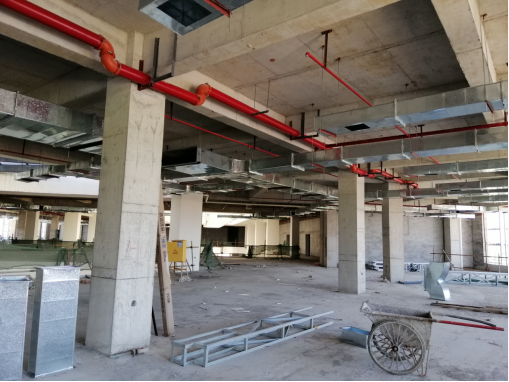 新校区扩建项目图书馆及学时报告厅工程2022年7月份形象进度:正在进行新风管道安装、屋面砖施工。