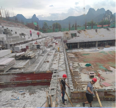 新校区扩建项目综合体育馆工程2022年7月份形象进度:已完成看台混凝土浇筑、五层结构楼板混凝土浇筑、正在进行6层结构支模架施工。