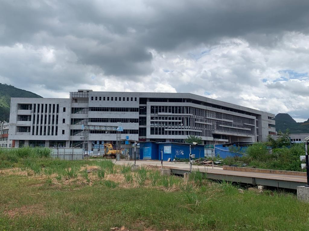 新校区扩建项目图书馆及学时报告厅工程2022年8月份形象进度:完成屋面砖铺贴、4层新风管道安装、大门台阶砌筑。