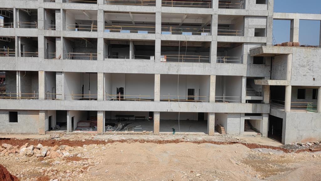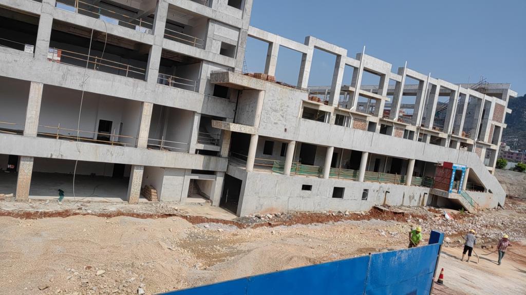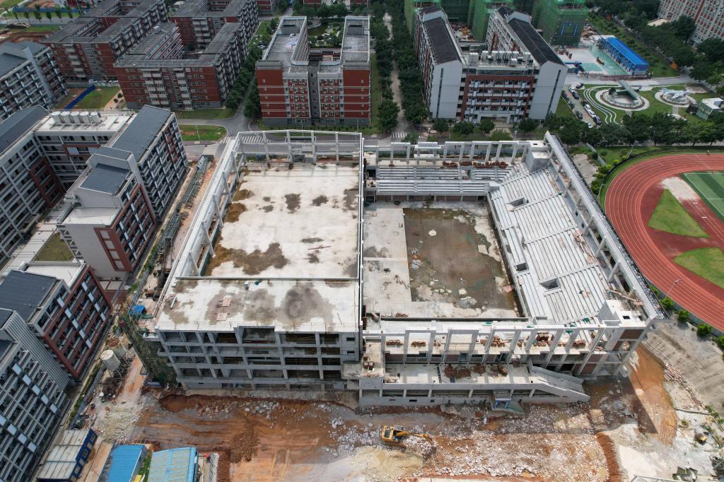 新校区扩建项目综合体育馆工程2023年5月份形象进度:完成钢结构吊装场地平整。