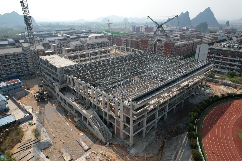 新校区扩建项目综合体育馆工程2023年11月份形象进度:完成B区7榀大梁的吊装,马道安装完成20%。