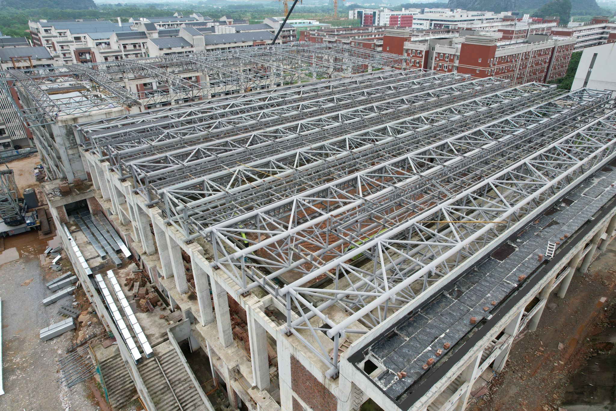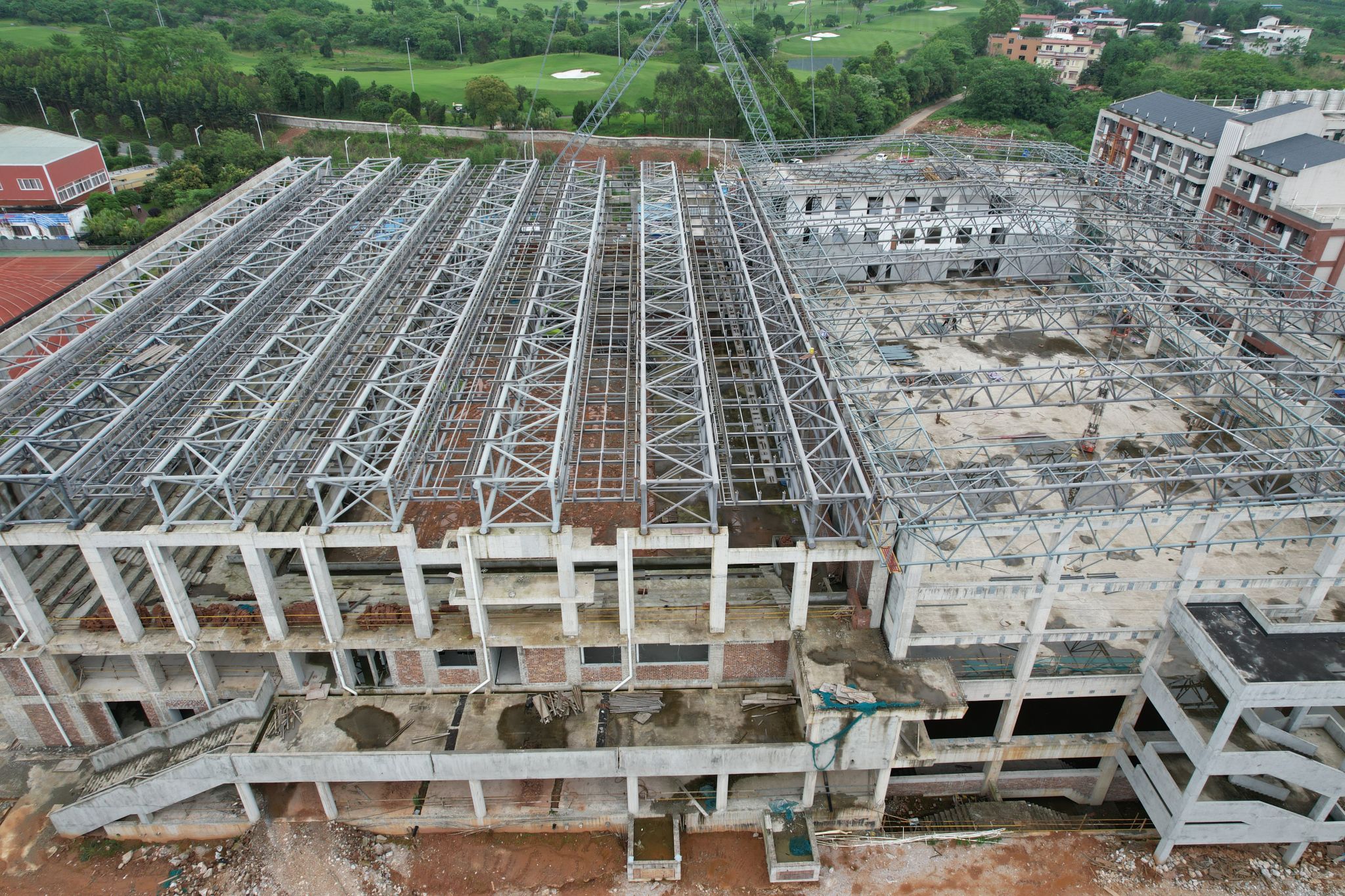 新校区扩建项目综合体育馆工程2024年4月份形象进度:完成钢桁架梁,正在施工天沟、檩条,完成幕墙预埋板,准备安装龙骨。