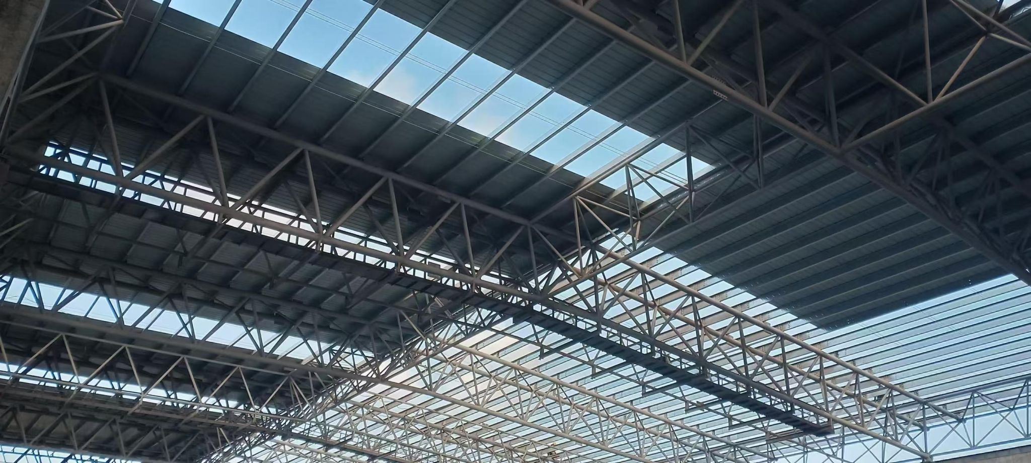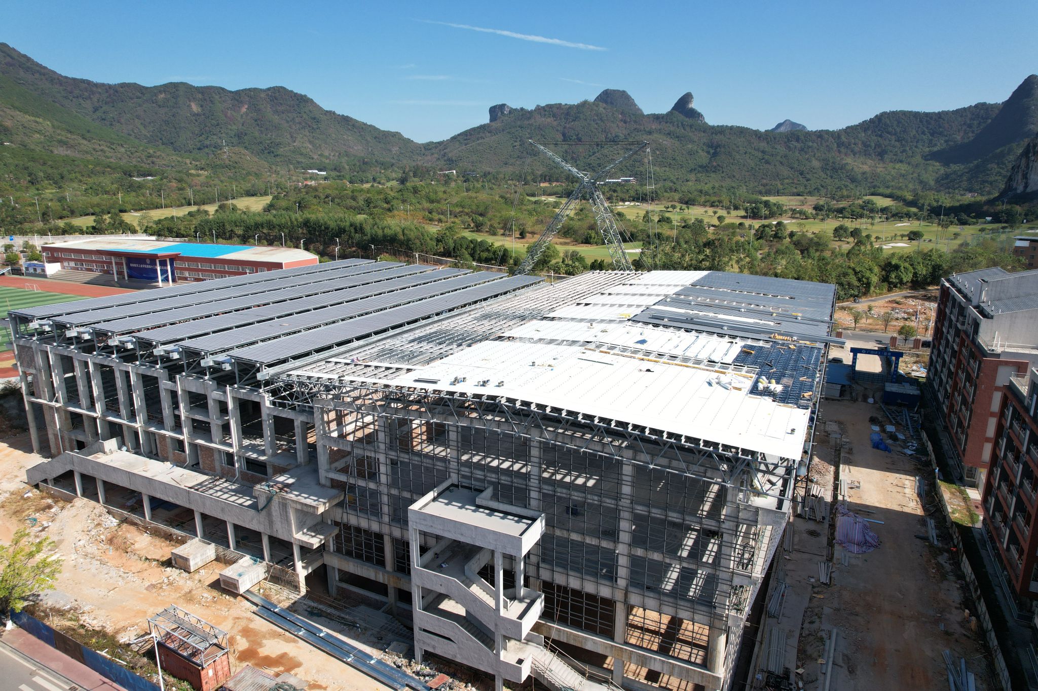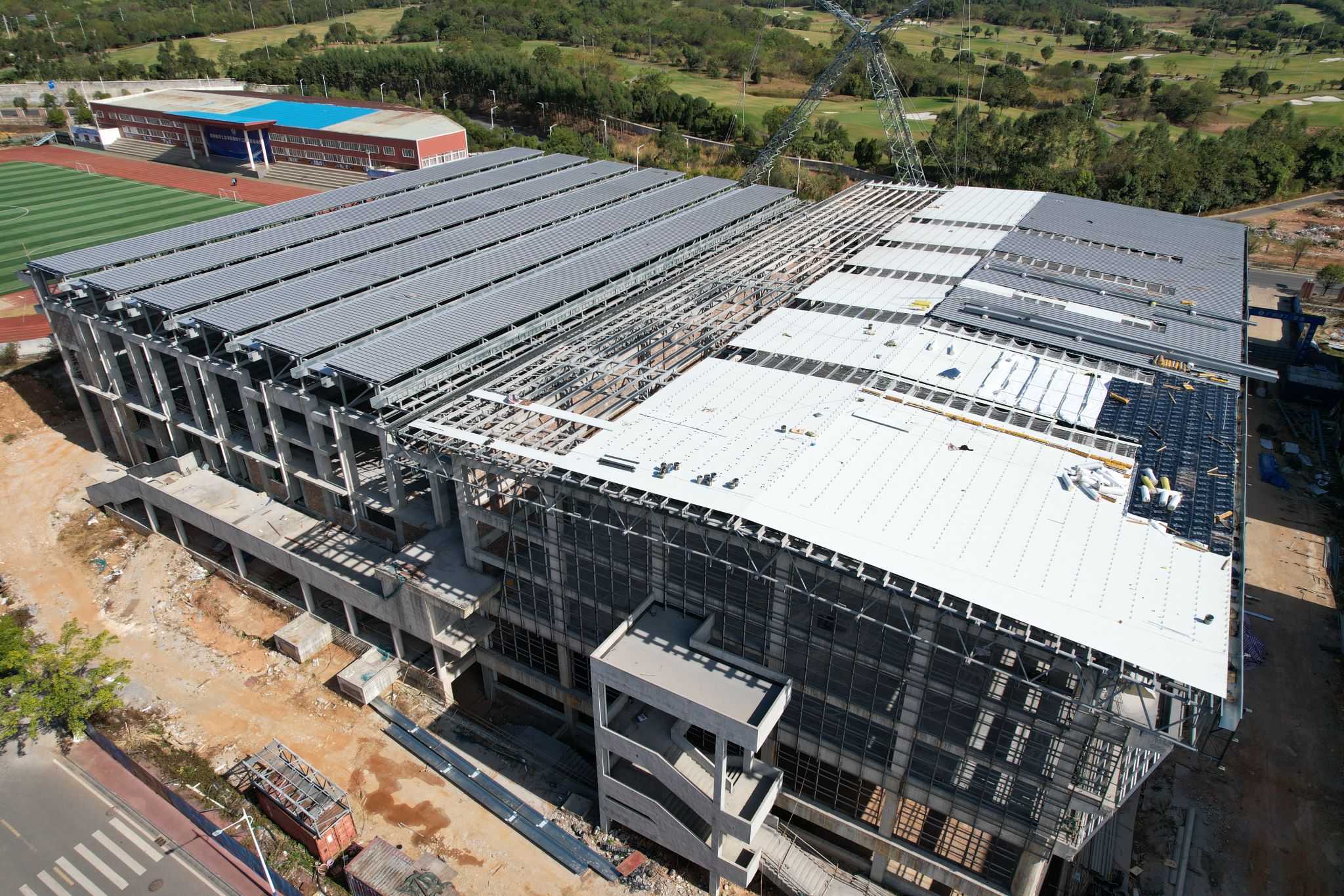 新校区扩建项目综合体育馆工程2024年11月份形象进度:完成A区檩条安装,A区底瓦70%、B区聚碳酸酯板完成80%。