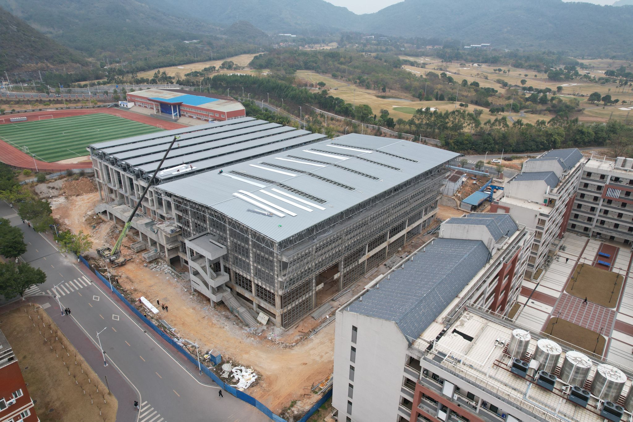 新校区扩建项目综合体育馆工程2024年12月份形象进度:完成A区屋面铝镁锰板,正在施工内墙吸音板龙骨、暖通水冷系统管道、排烟管等,完成总工程量的70%。