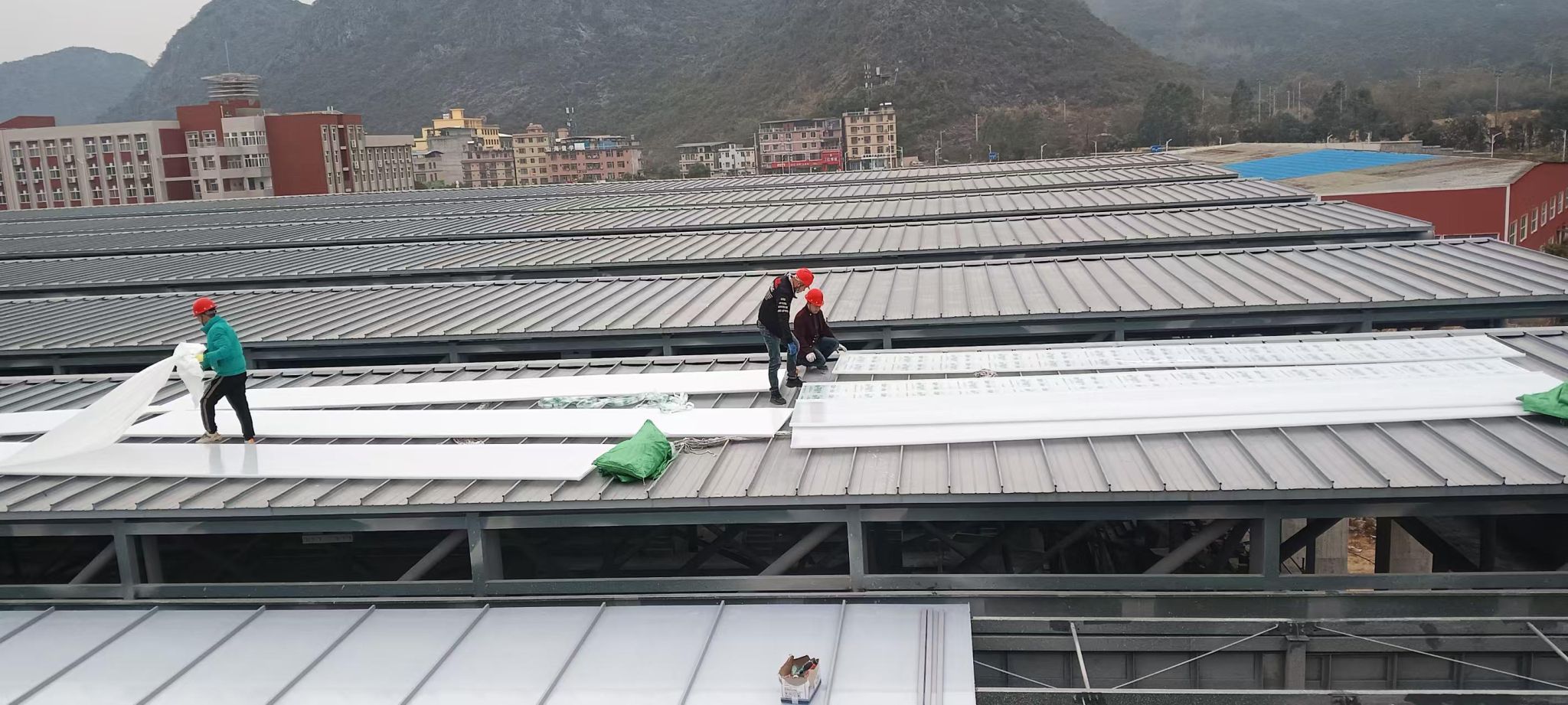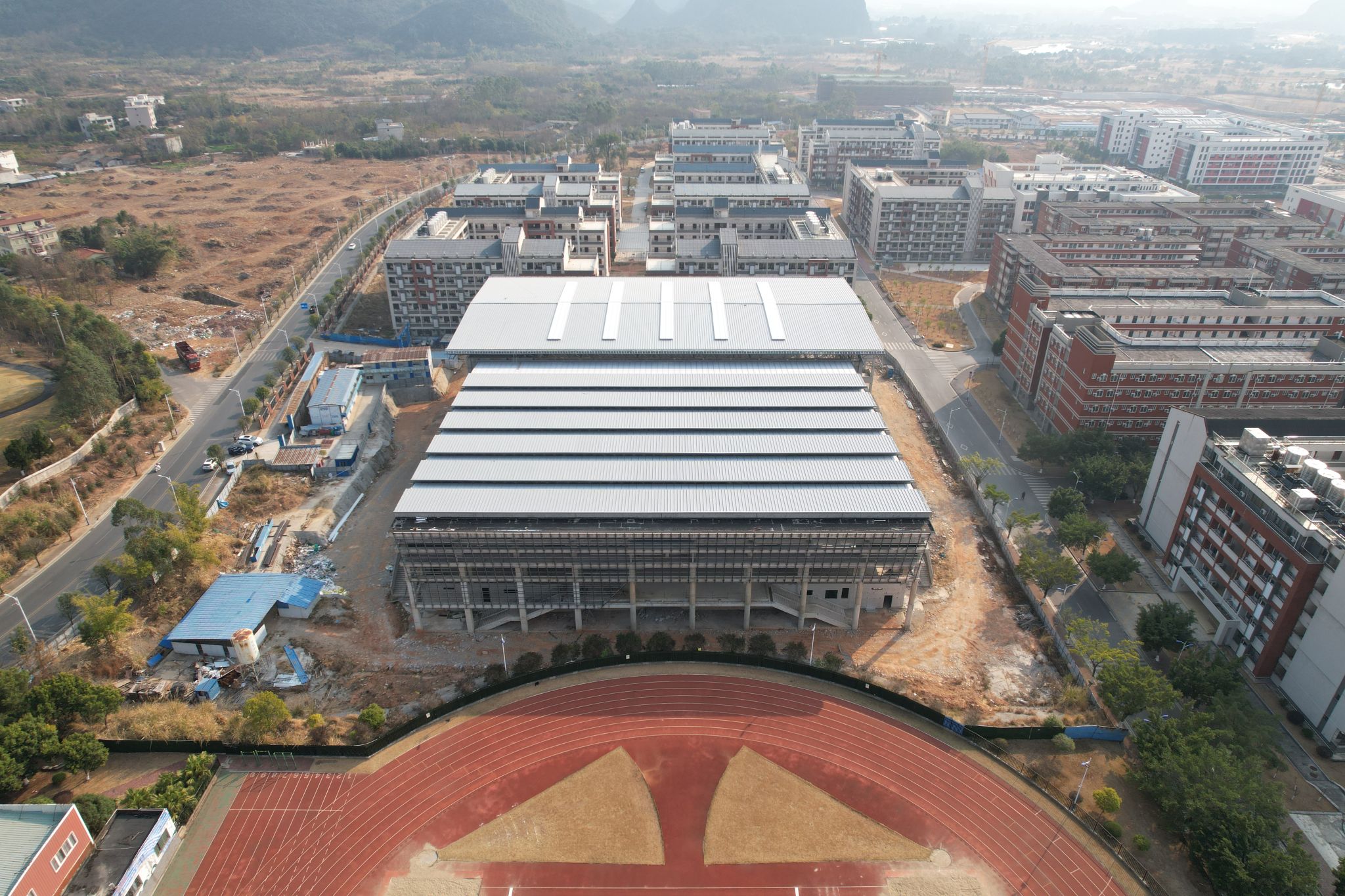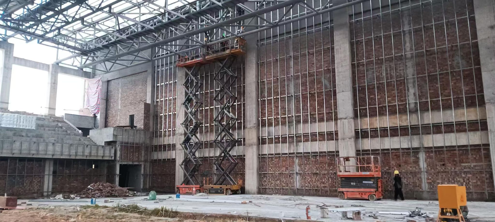 新校区扩建项目综合体育馆工程2025年1月份施工内容包括屋面阳光板、室内吸音板龙骨、部分暖通管道安装及包封。