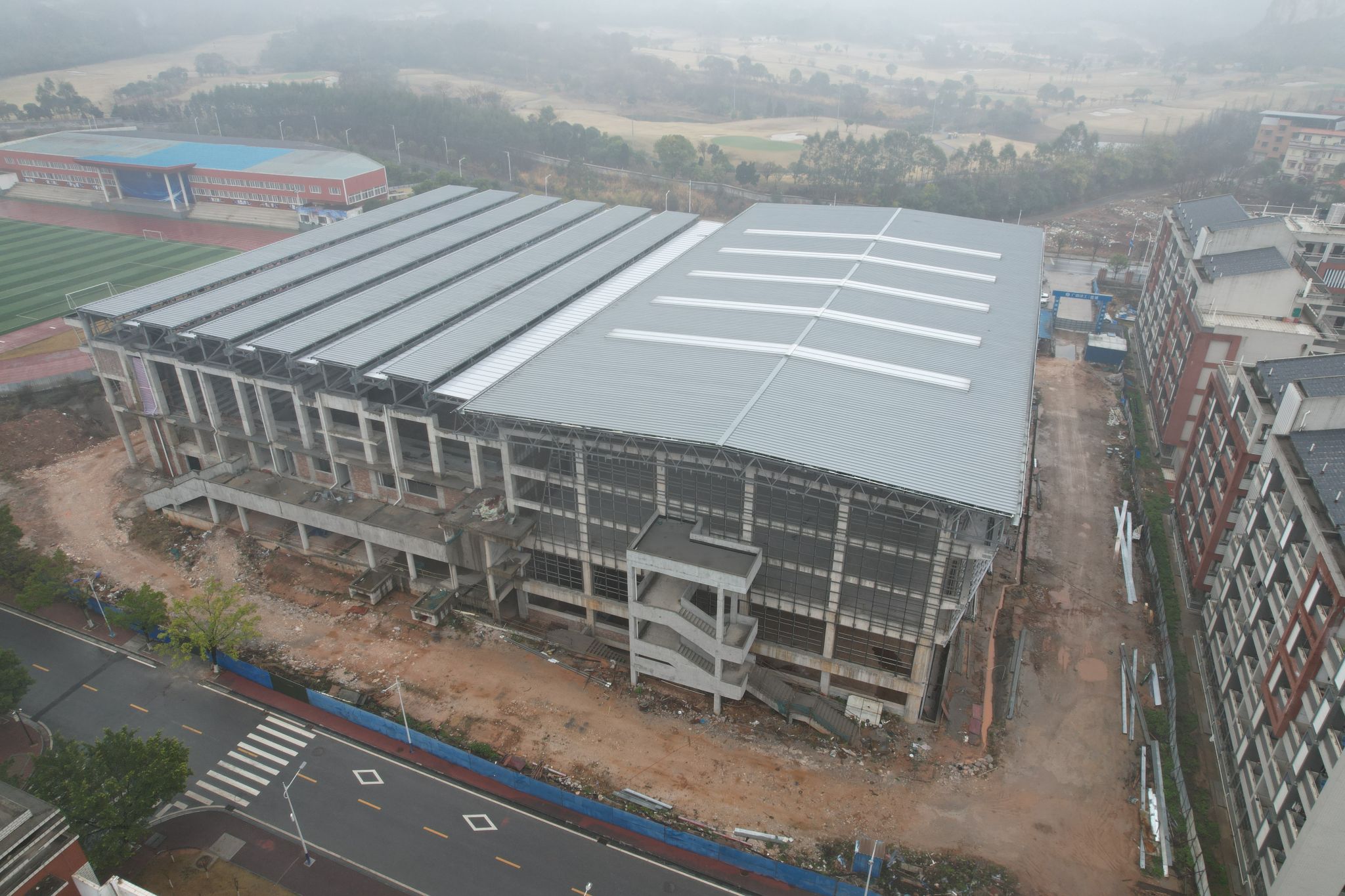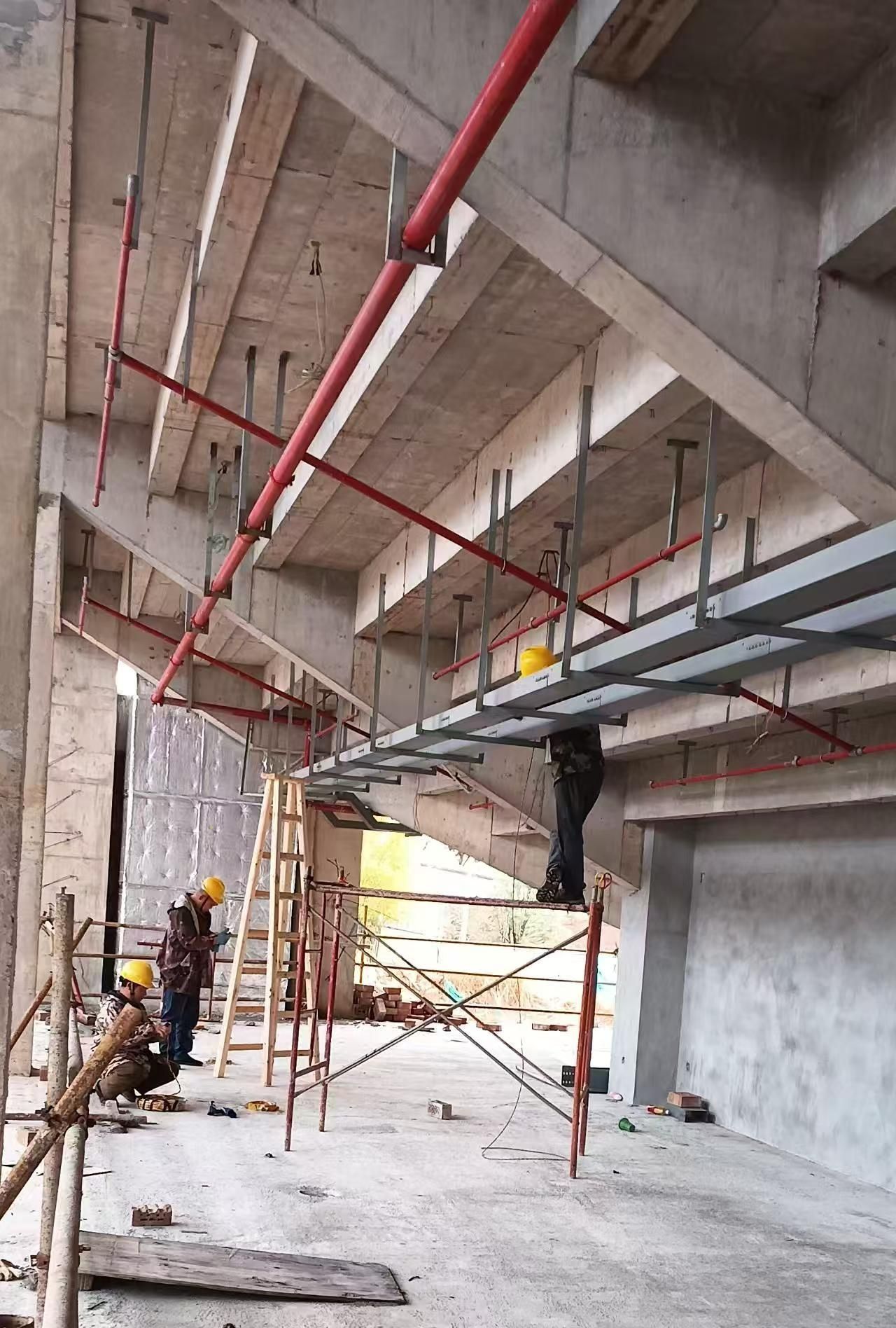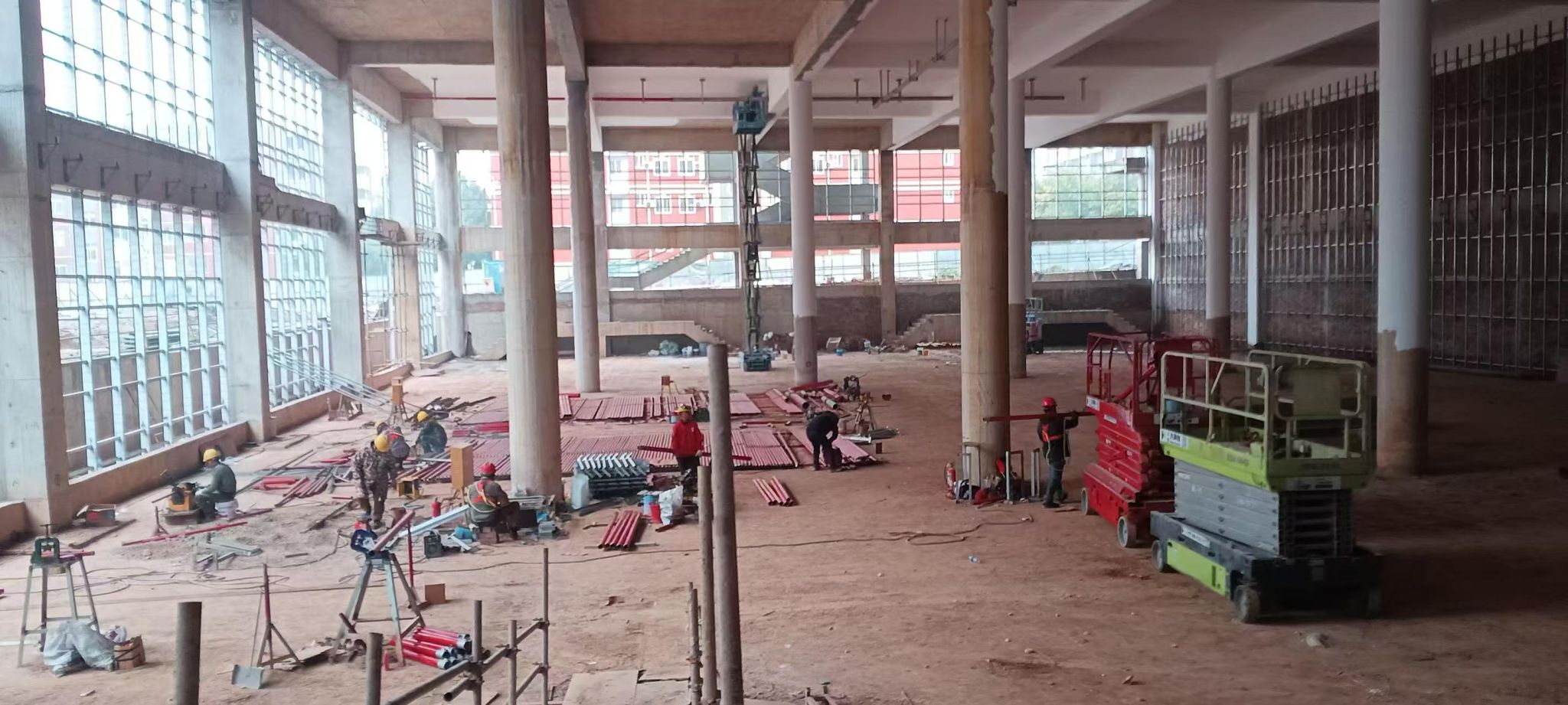 新校区扩建项目综合体育馆工程2025年2月份形象进度:正在进行消防管道安装、顶棚批白施工,同时空调设备和幕墙玻璃已进入排产阶段。
